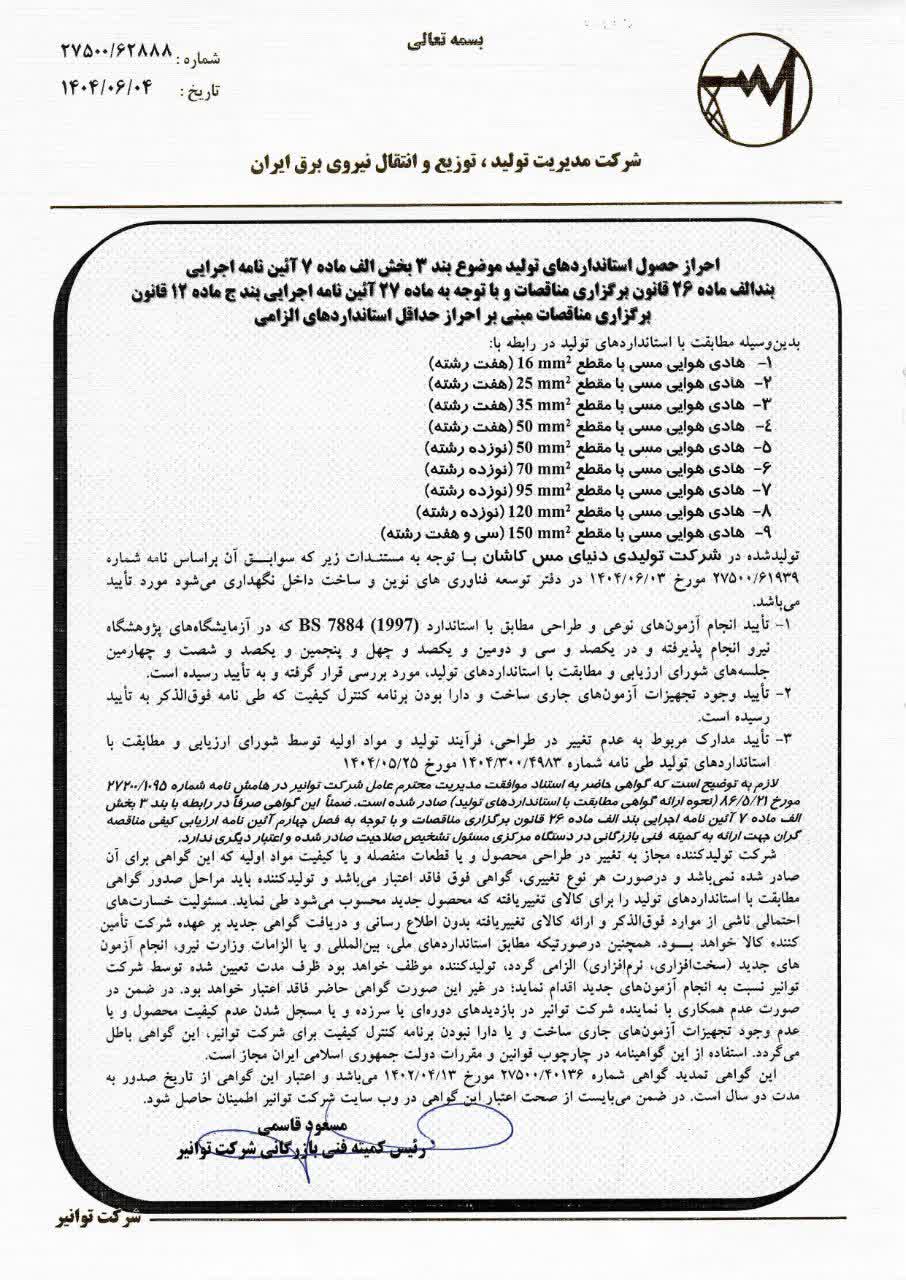 - «اخذ گواهینامه های معتبر نیازمند بازرسیهای دقیق توسط مراجع مستقل است. آزمایشگاه دنیای مس کاشان بهطور دورهای توسط ممیزان داخلی و خارجی مورد ارزیابی قرار میگیرد. این ممیزیها شامل بررسی روشهای آزمایش، کالیبراسیون تجهیزات، صلاحیت کارشناسان و مدیریت دادهها است. پس از تأیید، گواهینامهها صادر یا تمدید میشوند.»